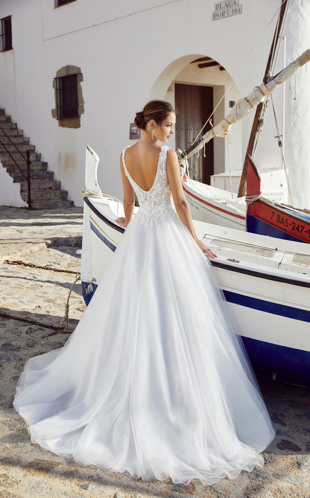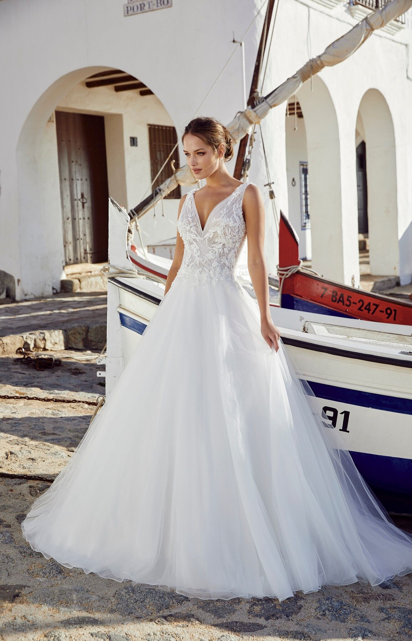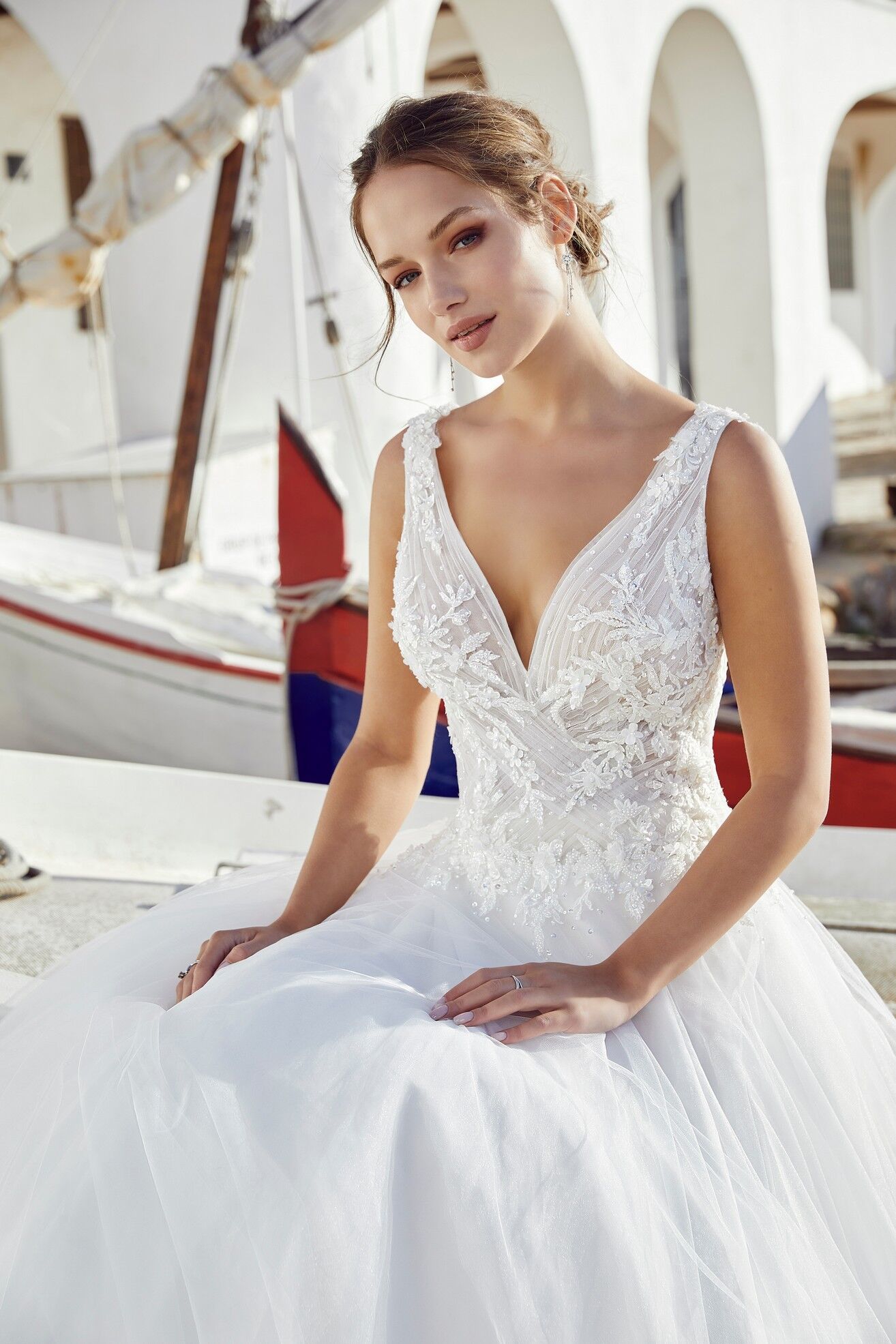 A magnificent ballgown wedding dress, perfect for a romantic bride. With a beautiful, plunged v-neckline and detailed lace applique which give a floral romantic style