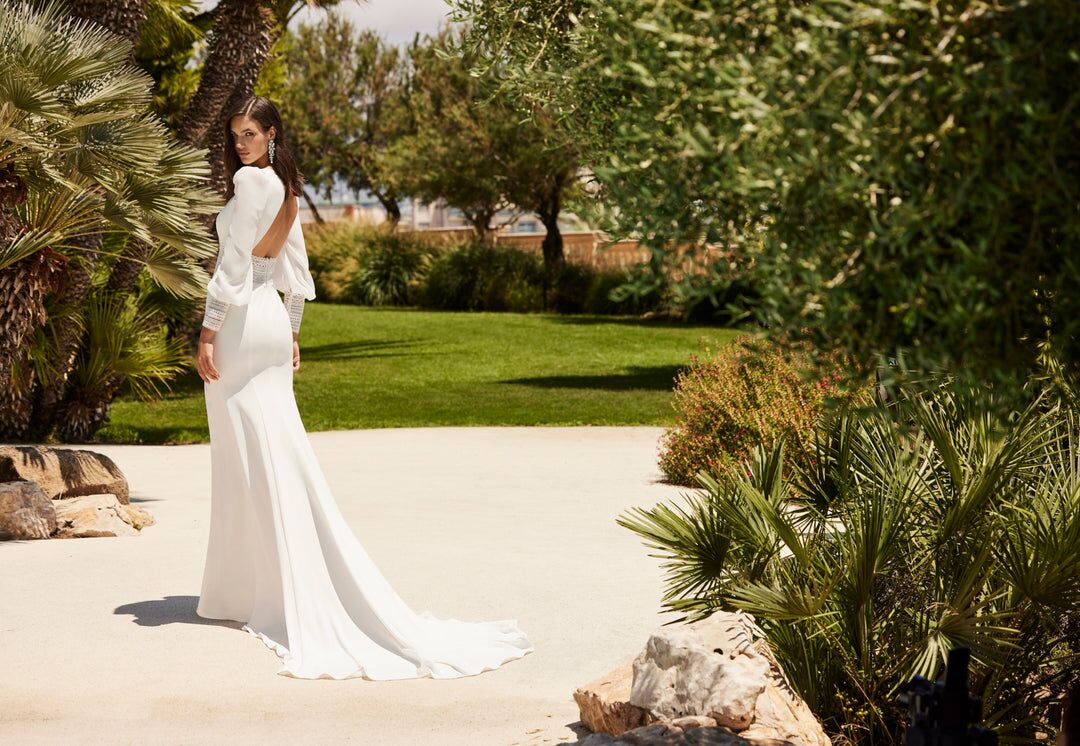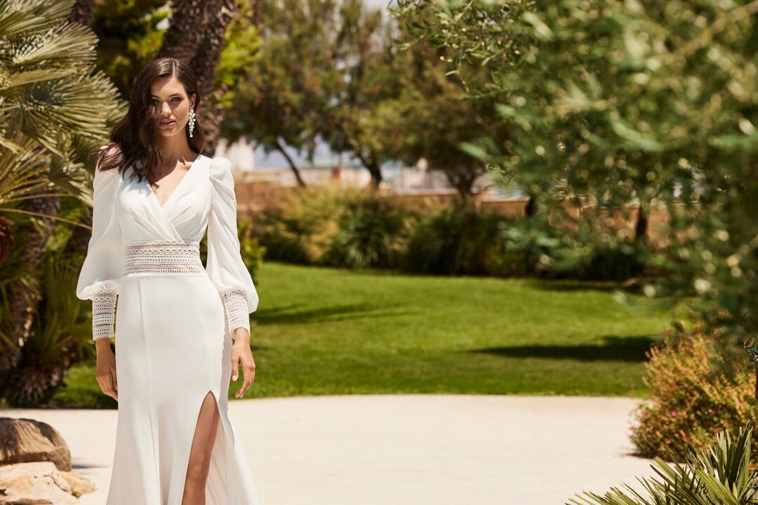 Inspirato In romantico stile boho elegante abito da sposa in crêpe e chiffon. Con un raffinato pizzo vintage trasparente che impreziosisce la vita e i polsini dell’abito, questo modello presenta anche una splendida scollatura a goccia sulla schiena, un tocco di stile boho per una sposa moderna.
