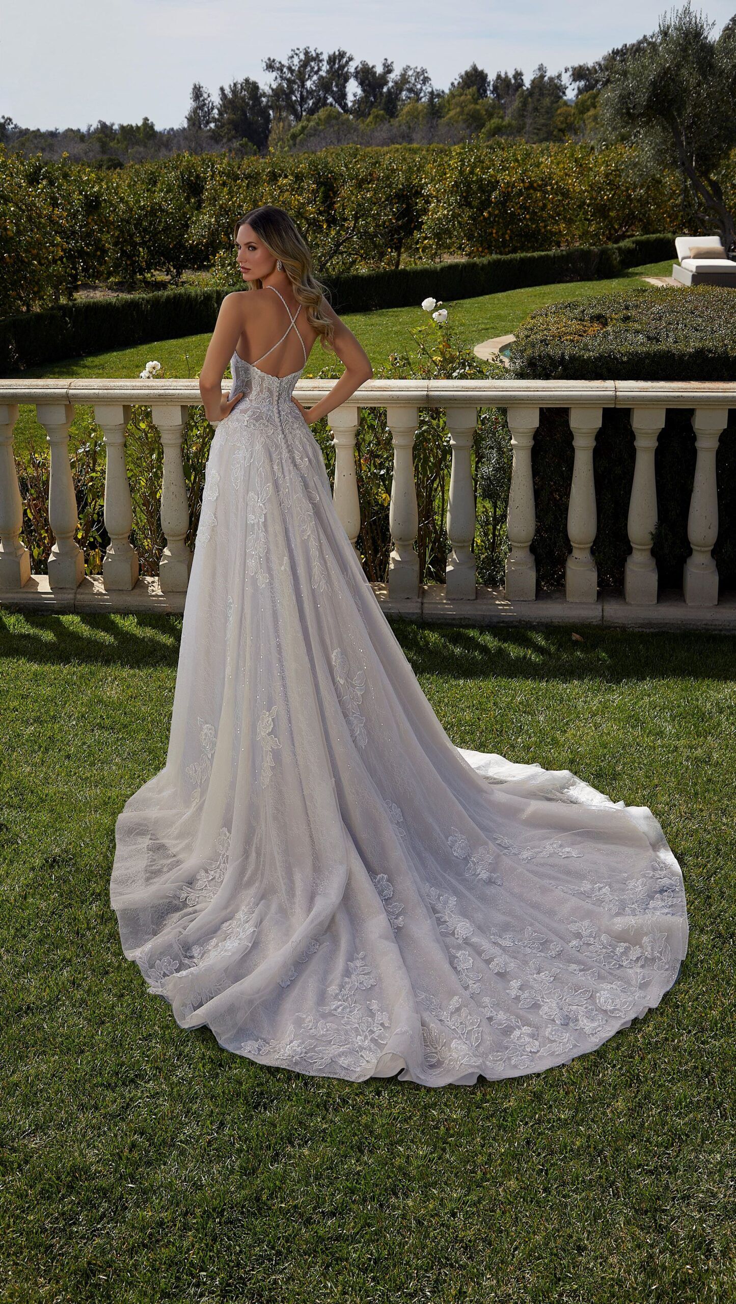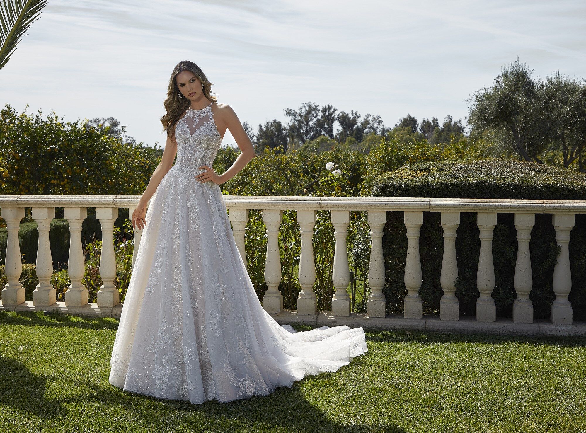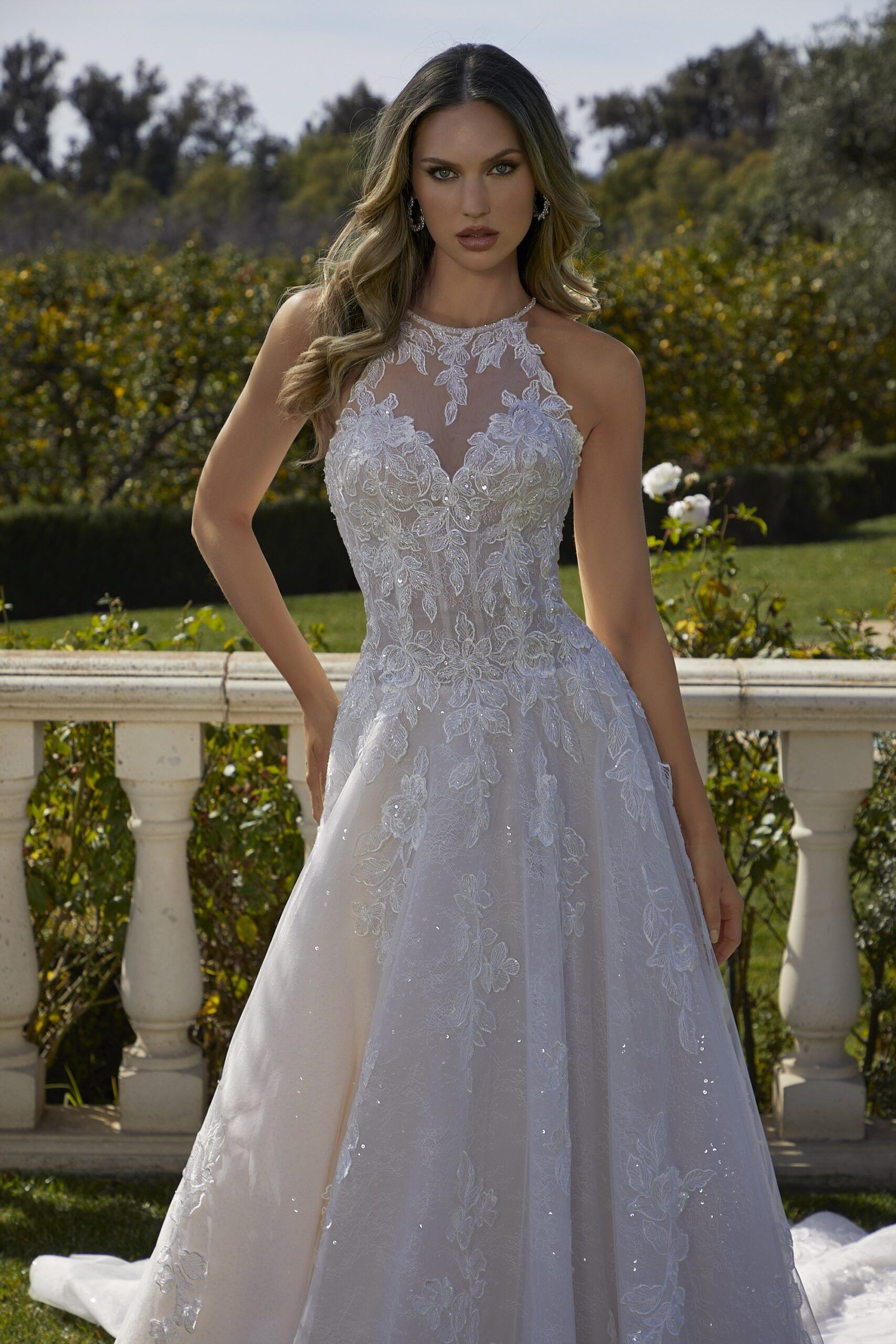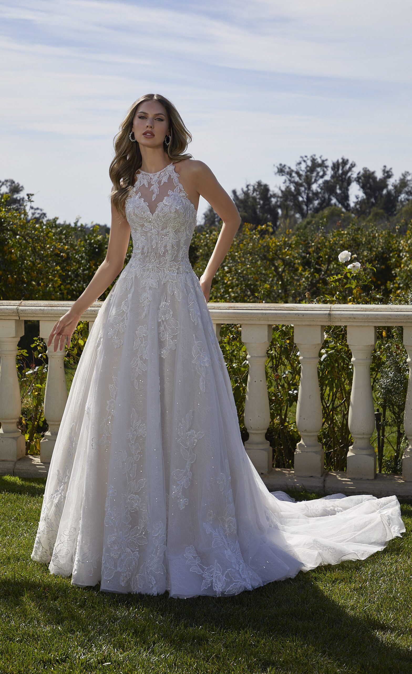 Crystal Beaded, Embroidered Lace Appliqués on a Tulle Over Frosted Chantilly Lace A-Line Ball Gown with Wide Hemline Border
