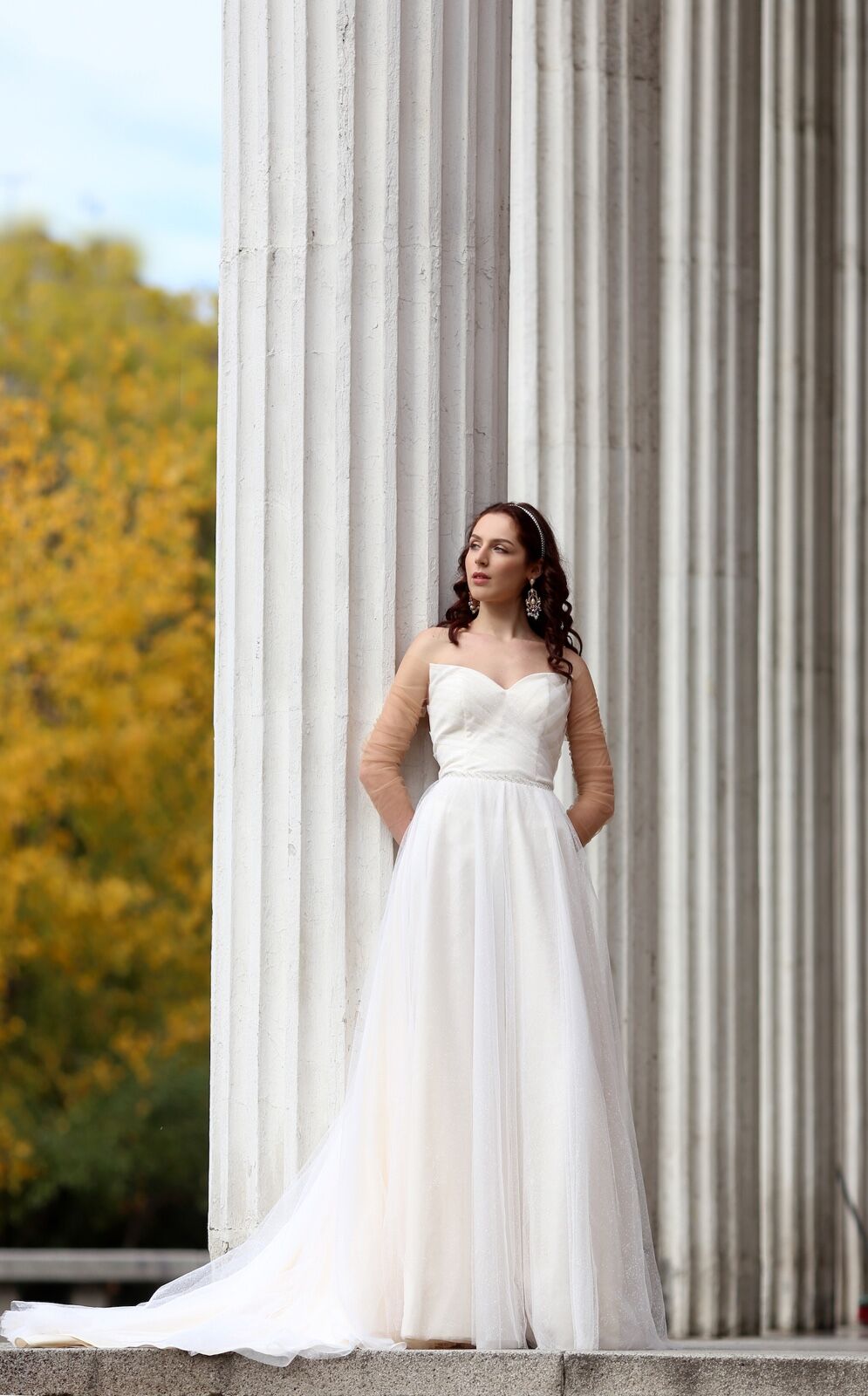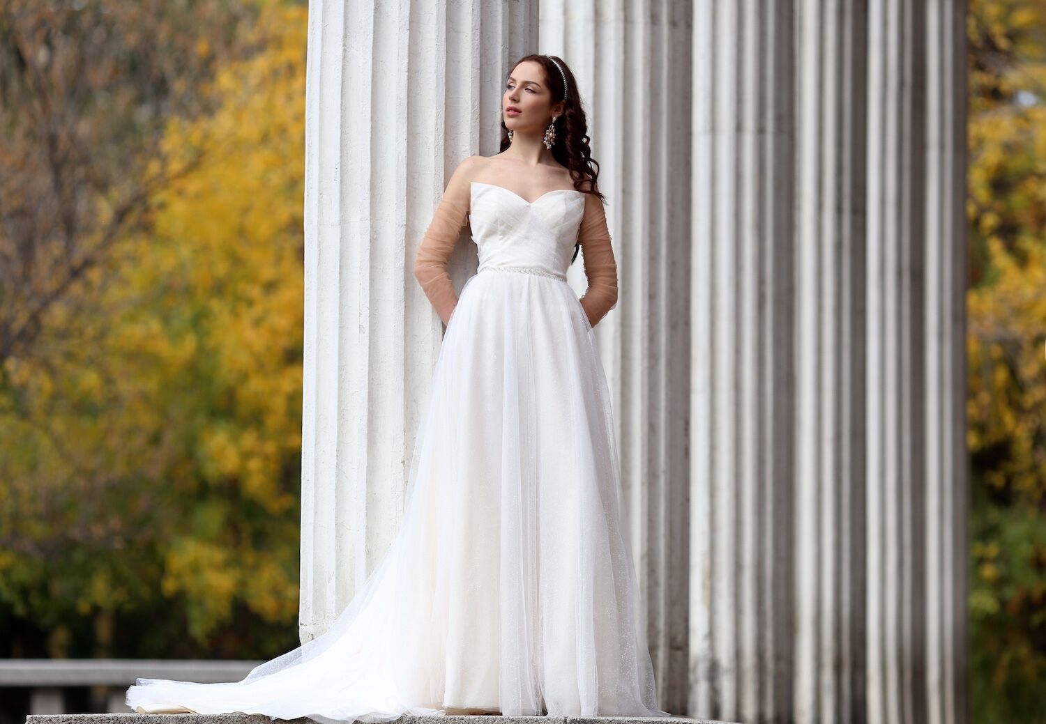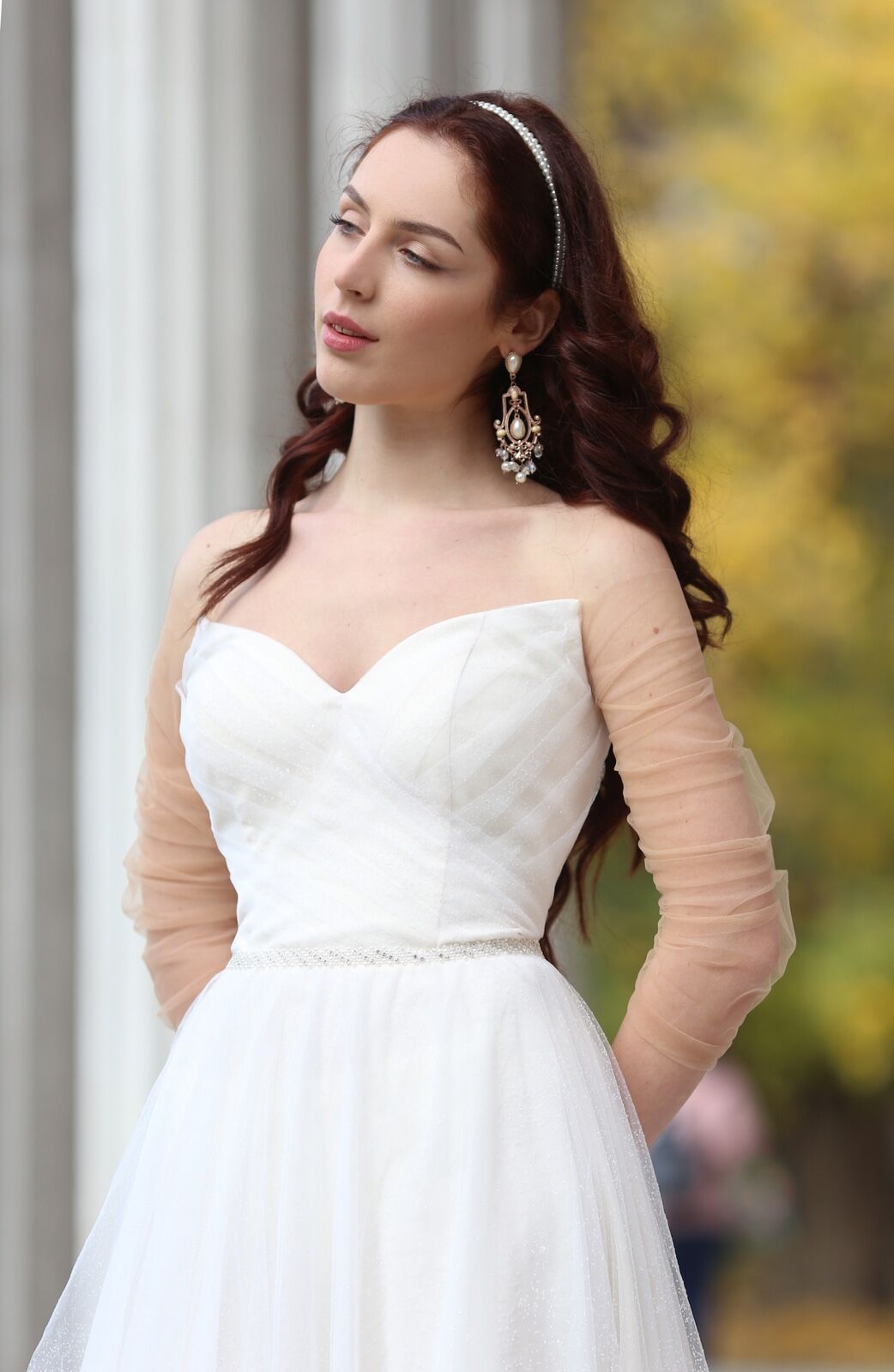 abito da sposa in tulle brillantinato con maniche lunghe, realizzabile su misura e personalizzabile