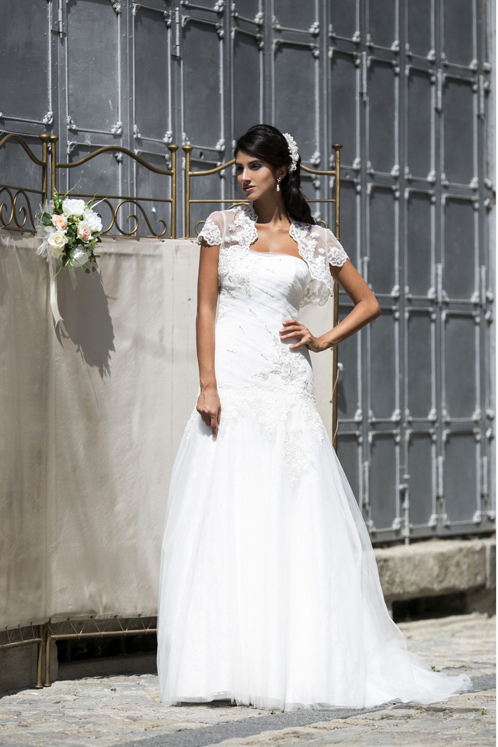 Abito da sposa modello Sofia, corpetto lungo realizzato in pizzo e tulle drappeggiato finemente ricamato a mano. Gonna in pizzo chantilly e tulle. Sconto del 50%
